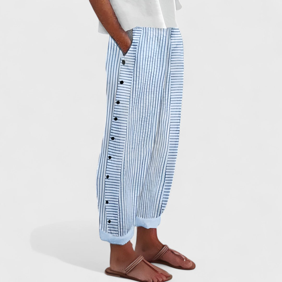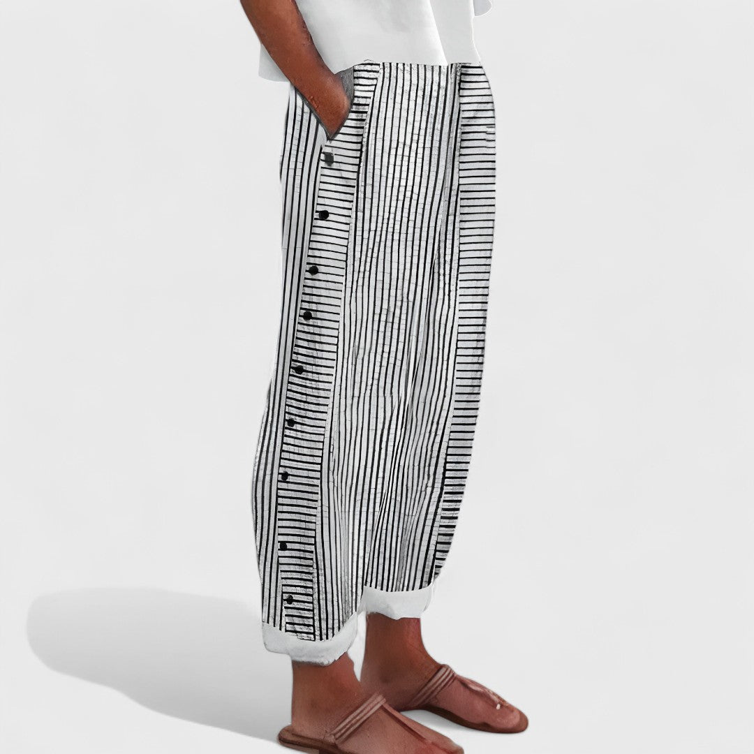 Kalhoty Věra jsou vyrobené z jemného lnu, který přirozeně chladí a dýchá. Díky volnému střihu a elastickému pasu nabízejí pohodlí, ale zároveň vypadají upraveně – ideální na procházky, večerní setkání nebo dny, kdy chcete vypadat stylově a zároveň se cítit dobře.