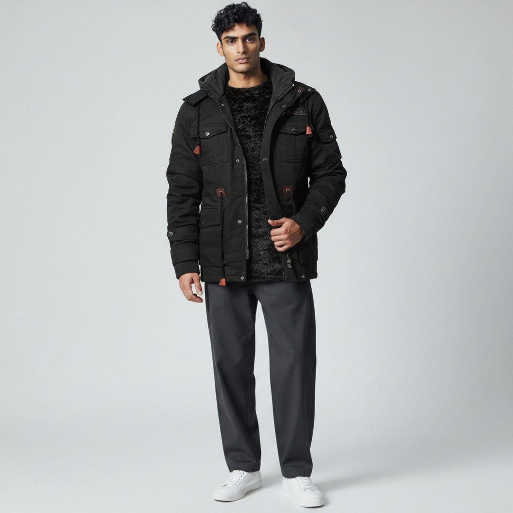 Bunda inspirovaná vojenským stylem, která spojuje odolnost a funkčnost. Přední zapínání na zip a knoflíky poskytuje zvýšenou ochranu, zatímco vysoký límec a nastavitelné šňůrky dodávají praktičnost i styl. Více předních kapes a přídavná kapsa na rukávu nabízejí dostatek prostoru pro každodenní potřeby, díky čemuž je tento kousek univerzální a odolný. Měkká podšívka zajišťuje extra pohodlí, ideální pro chladné dny.