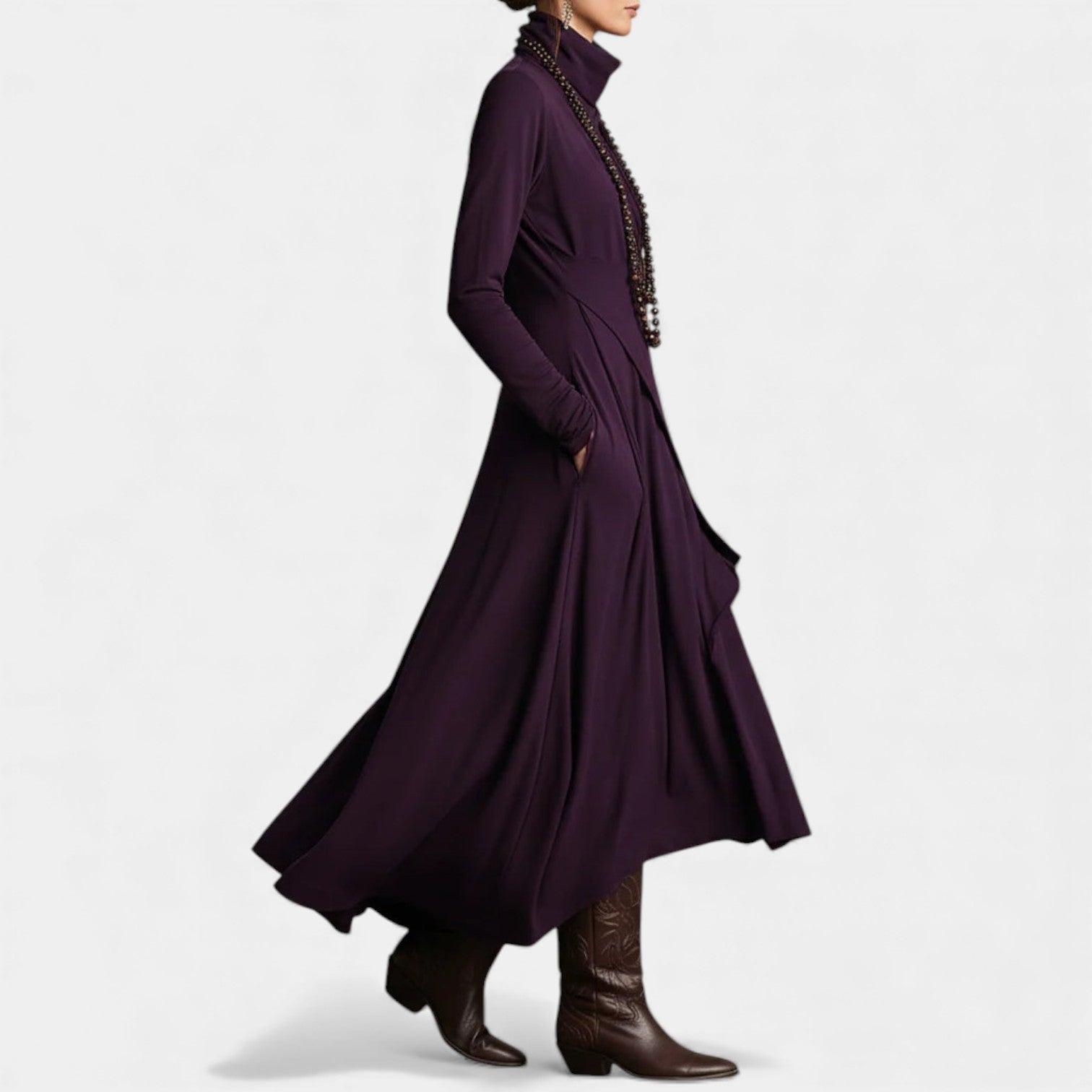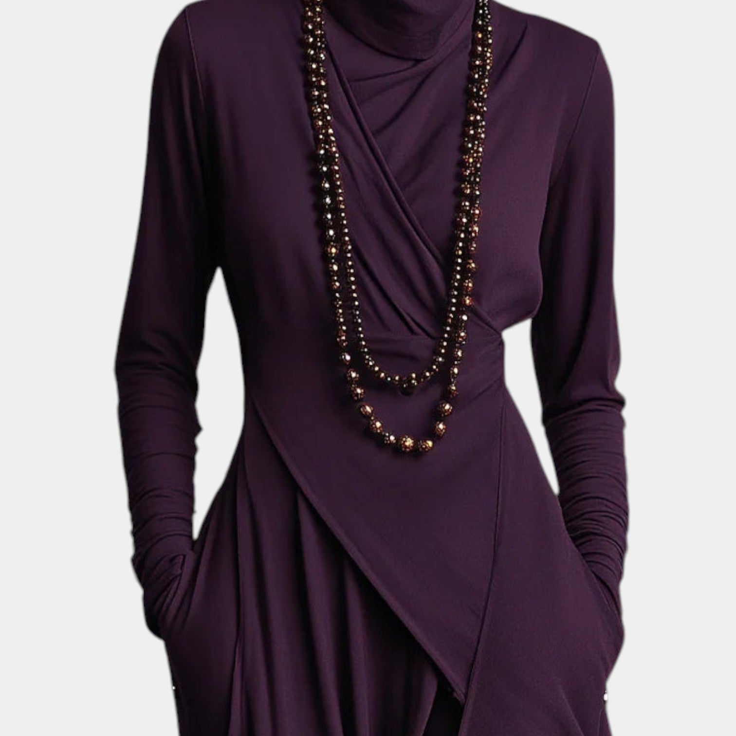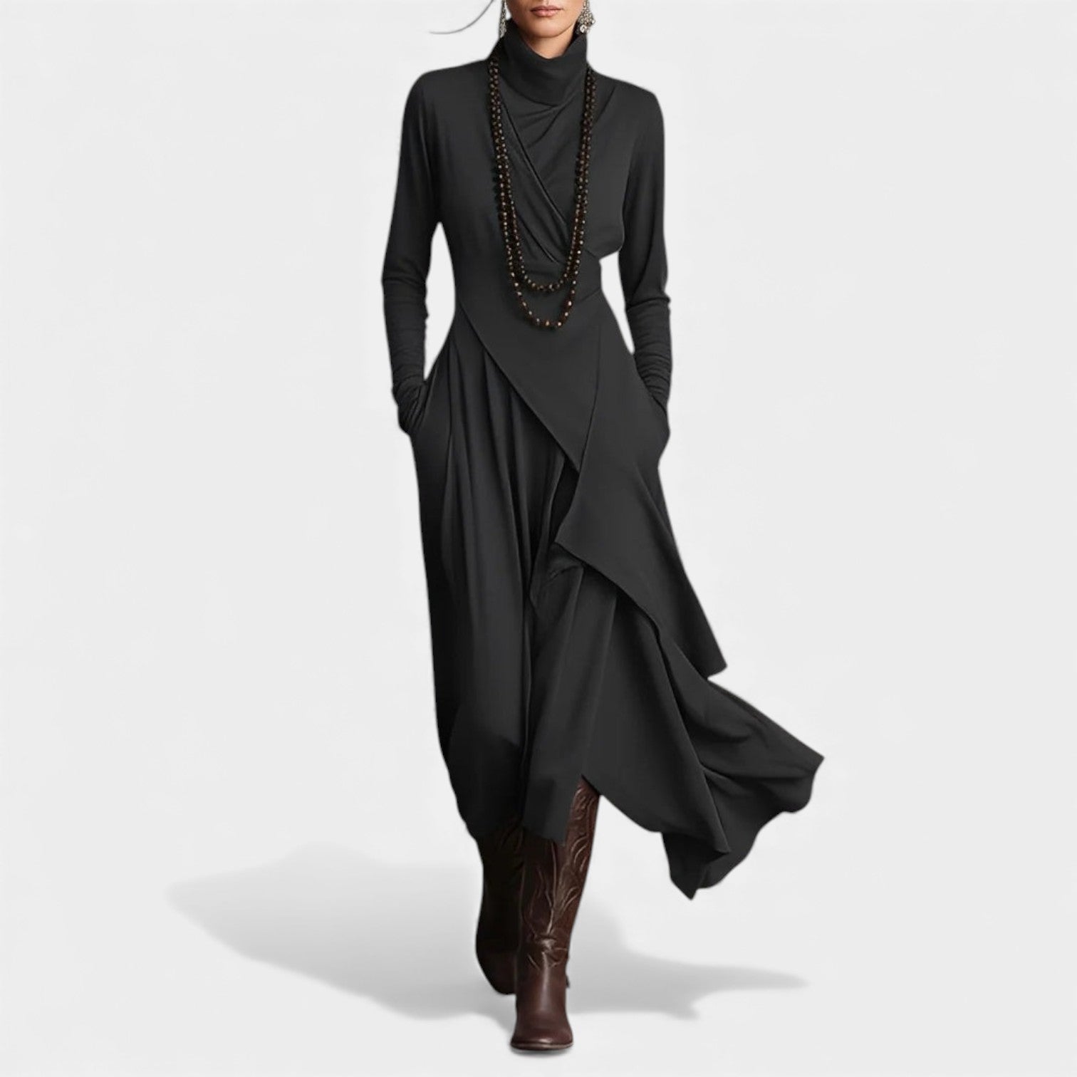• Elegantní asymetrické detaily – Vrstvený lem a volány vytvářejí graciézní, tekoucí linii, která zdůrazňuje postavu.