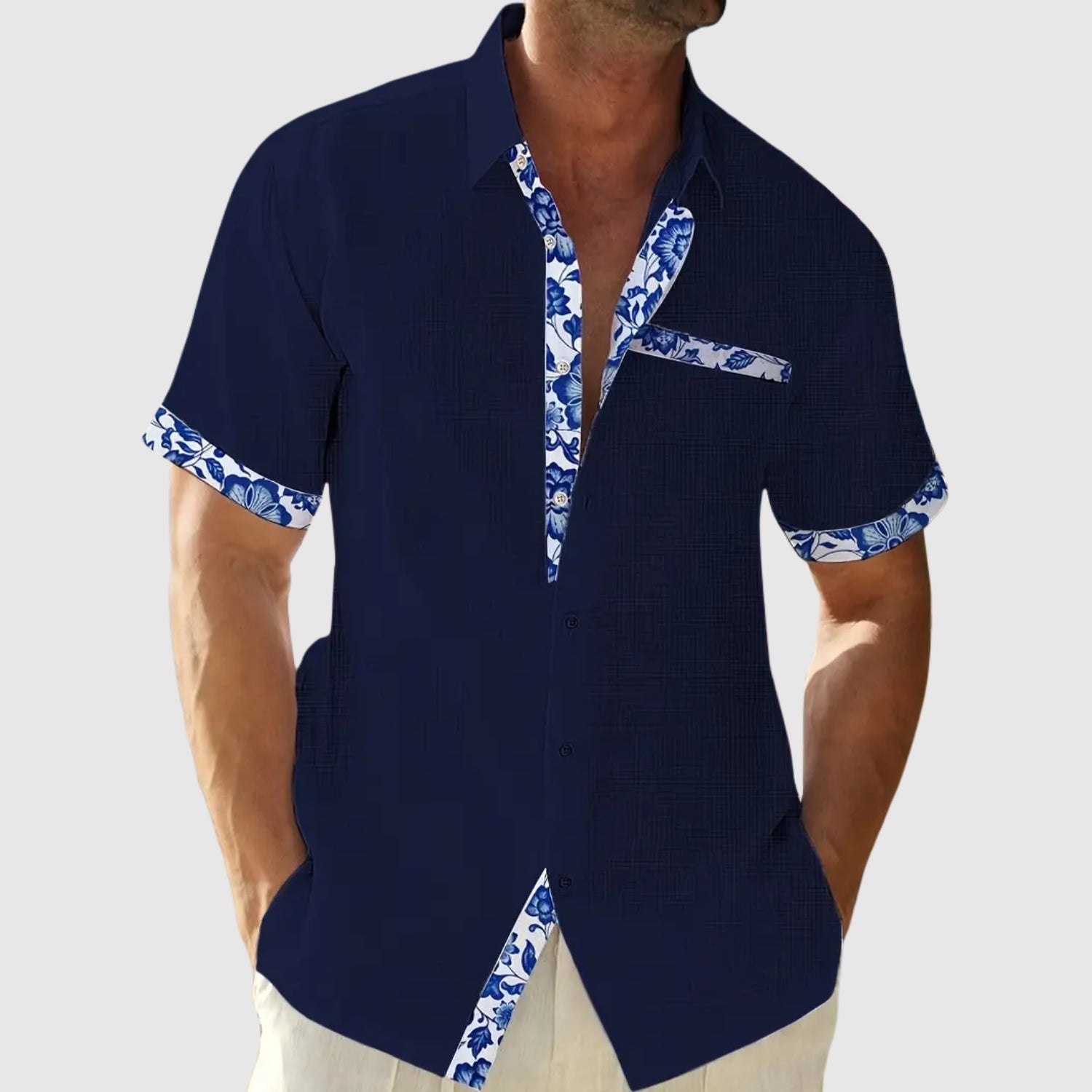 Tato košile s krátkými rukávy, navržená pro slunečné dny, kombinuje svěžest a eleganci s nádechem živosti. Kontrastní detaily na límci, kapse a rukávech dodávají charakteru uvolněnému vzhledu, který je ideální na pláž, do města nebo na letní výlet.