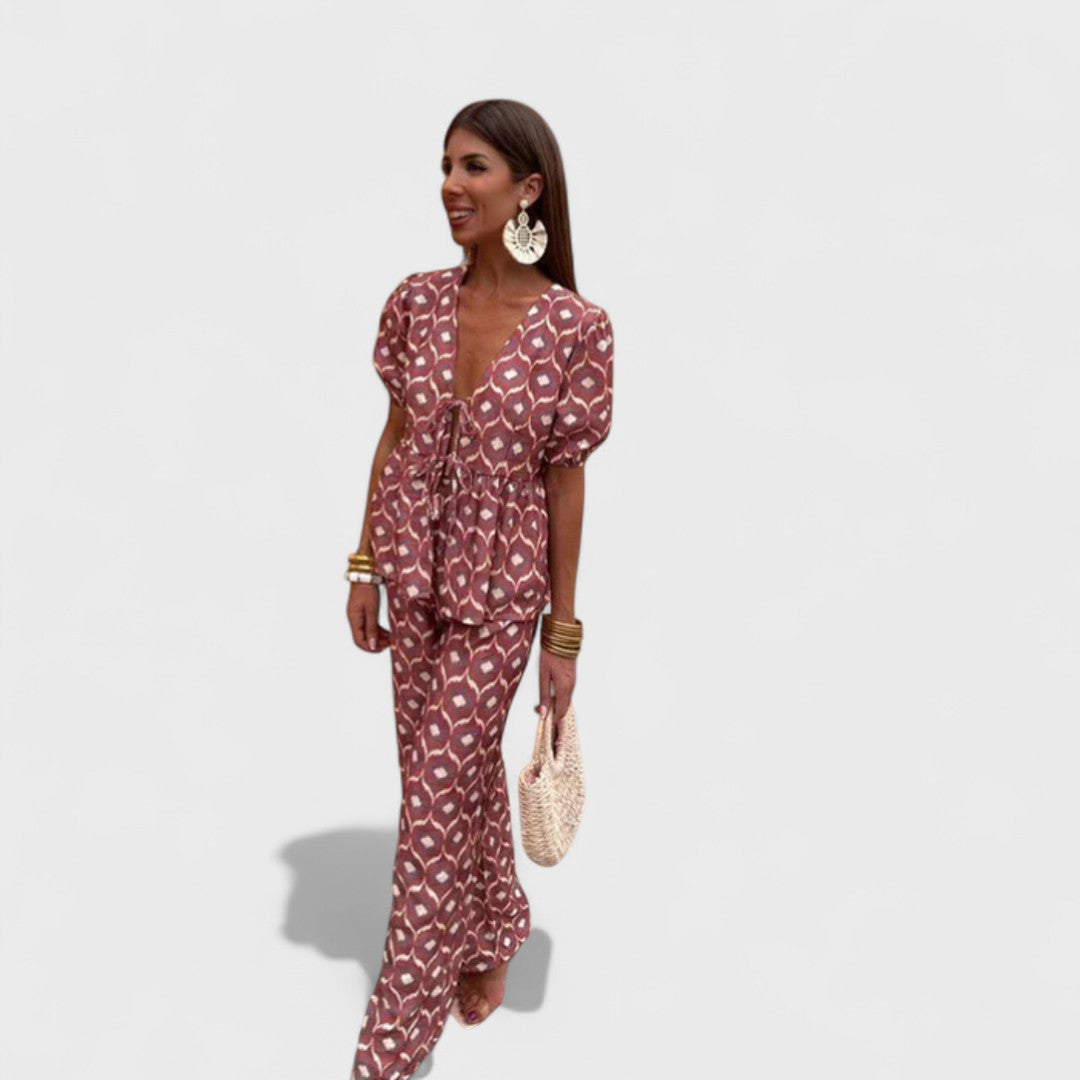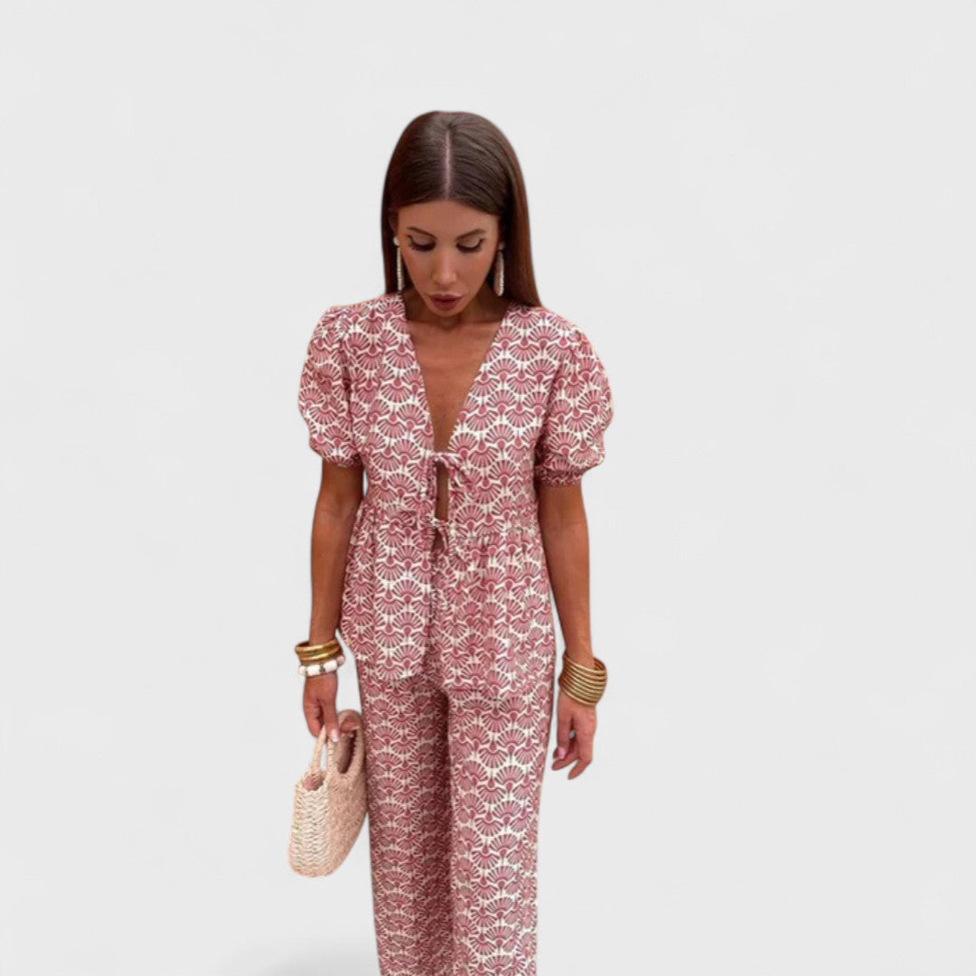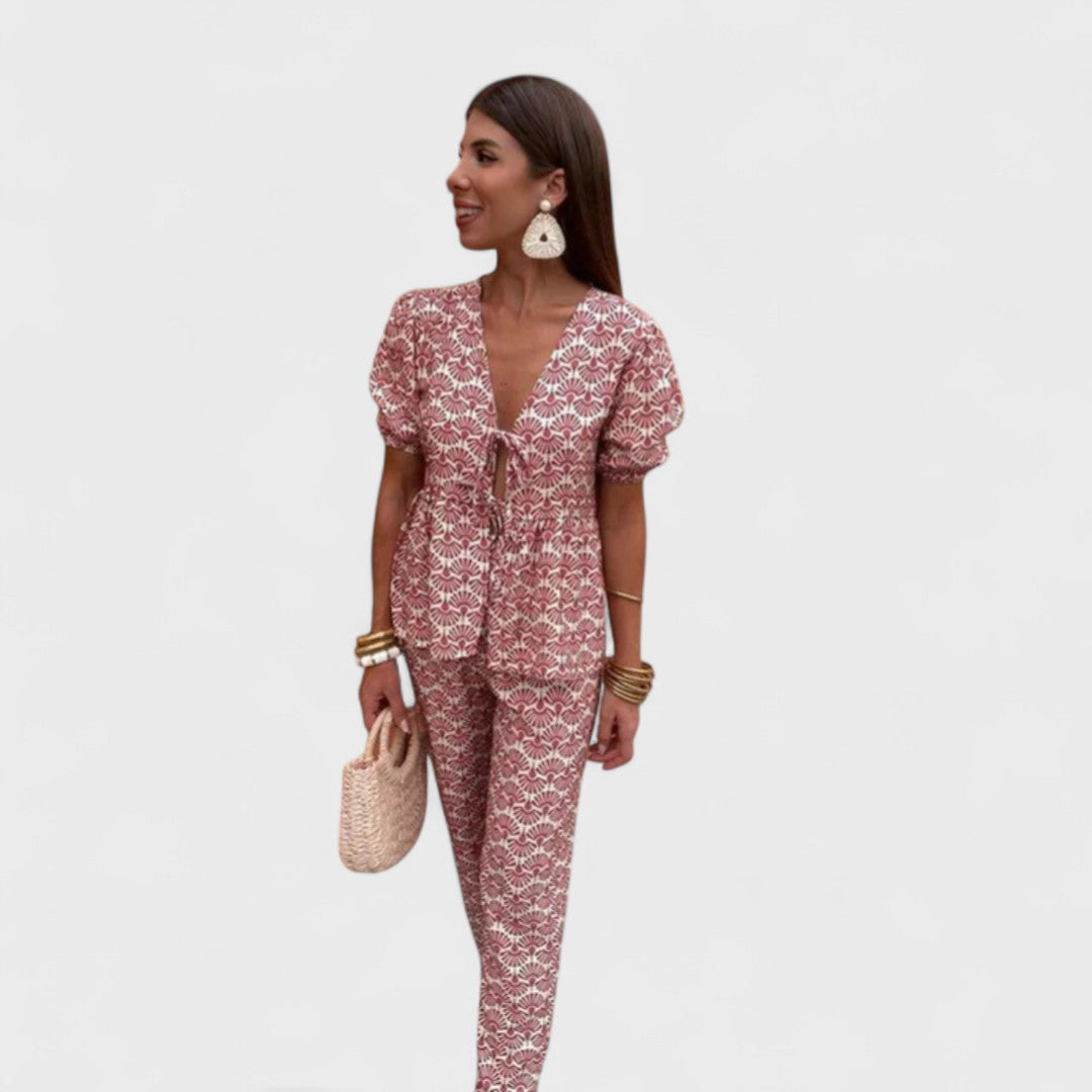 Naše oblíbená souprava Gracia je dokonalou kombinací ženskosti, pohodlí a stylu, ideální pro horké letní dny. Tento komplet se skládá ze splývavé halenky s krátkými rukávy a odpovídajících lehkých kalhot, které vytvářejí harmonický, ženský a snadno nositelný vzhled. Tento outfit je stvořen k tomu, abyste zářila den co den.