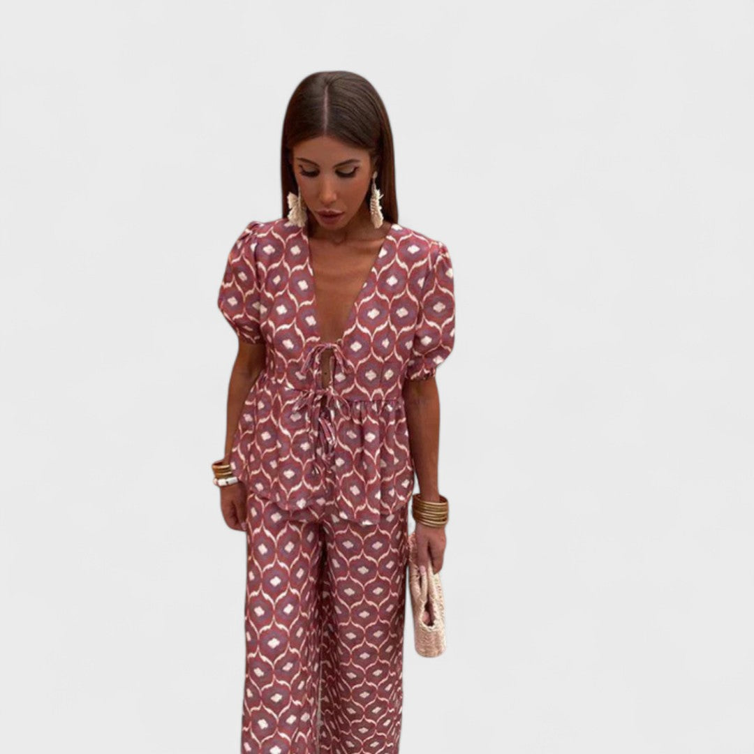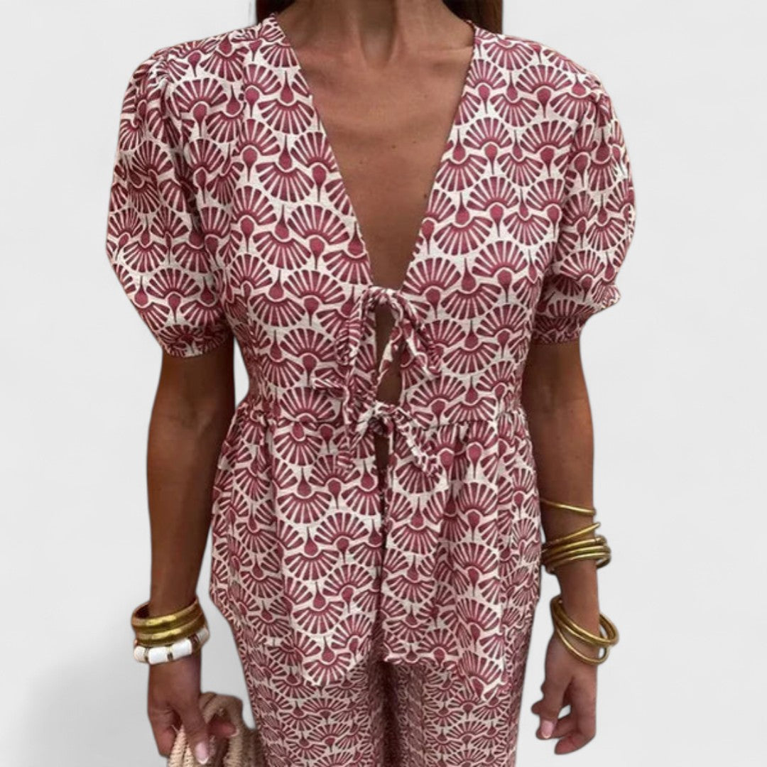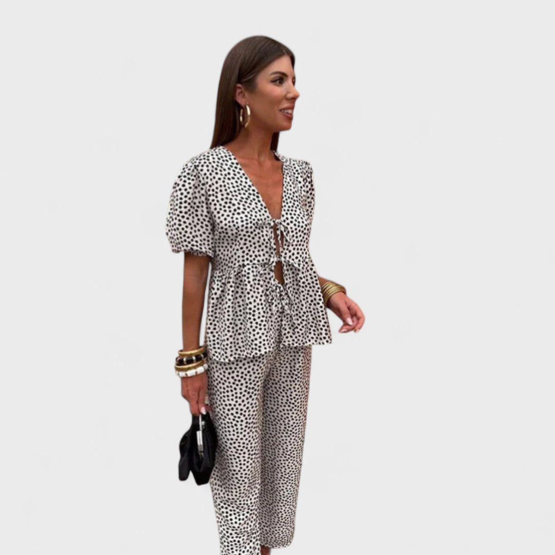 Naše oblíbená souprava Gracia je dokonalou kombinací ženskosti, pohodlí a stylu, ideální pro horké letní dny. Tento komplet se skládá ze splývavé halenky s krátkými rukávy a odpovídajících lehkých kalhot, které vytvářejí harmonický, ženský a snadno nositelný vzhled. Tento outfit je stvořen k tomu, abyste zářila den co den.