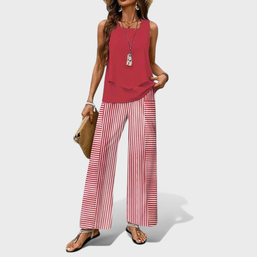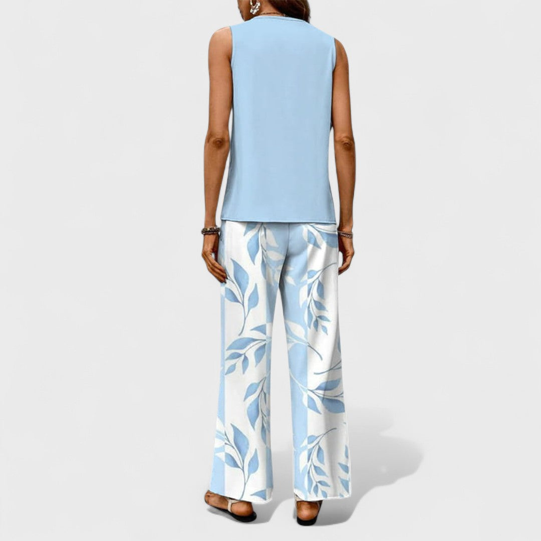 Set Katarína přináší luxus jednoduchosti a pohodlí ve stylové kombinaci. Horní část bez rukávů jemně obepíná postavu, zatímco lehké kalhoty s volným střihem dodávají pocit vzdušnosti a svobody. Vyrobený z kvalitního materiálu s jemným leskem, tento set je skvělou volbou pro pracovní dny, setkání s přáteli či letní večery plné elegance.