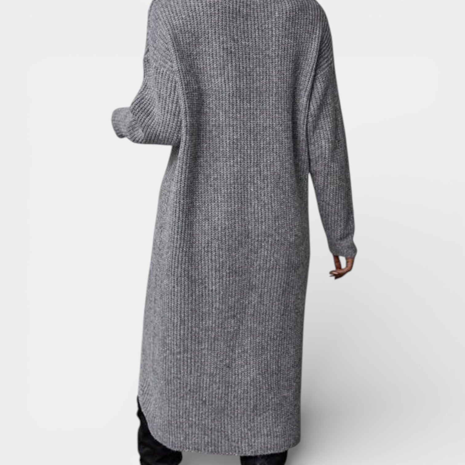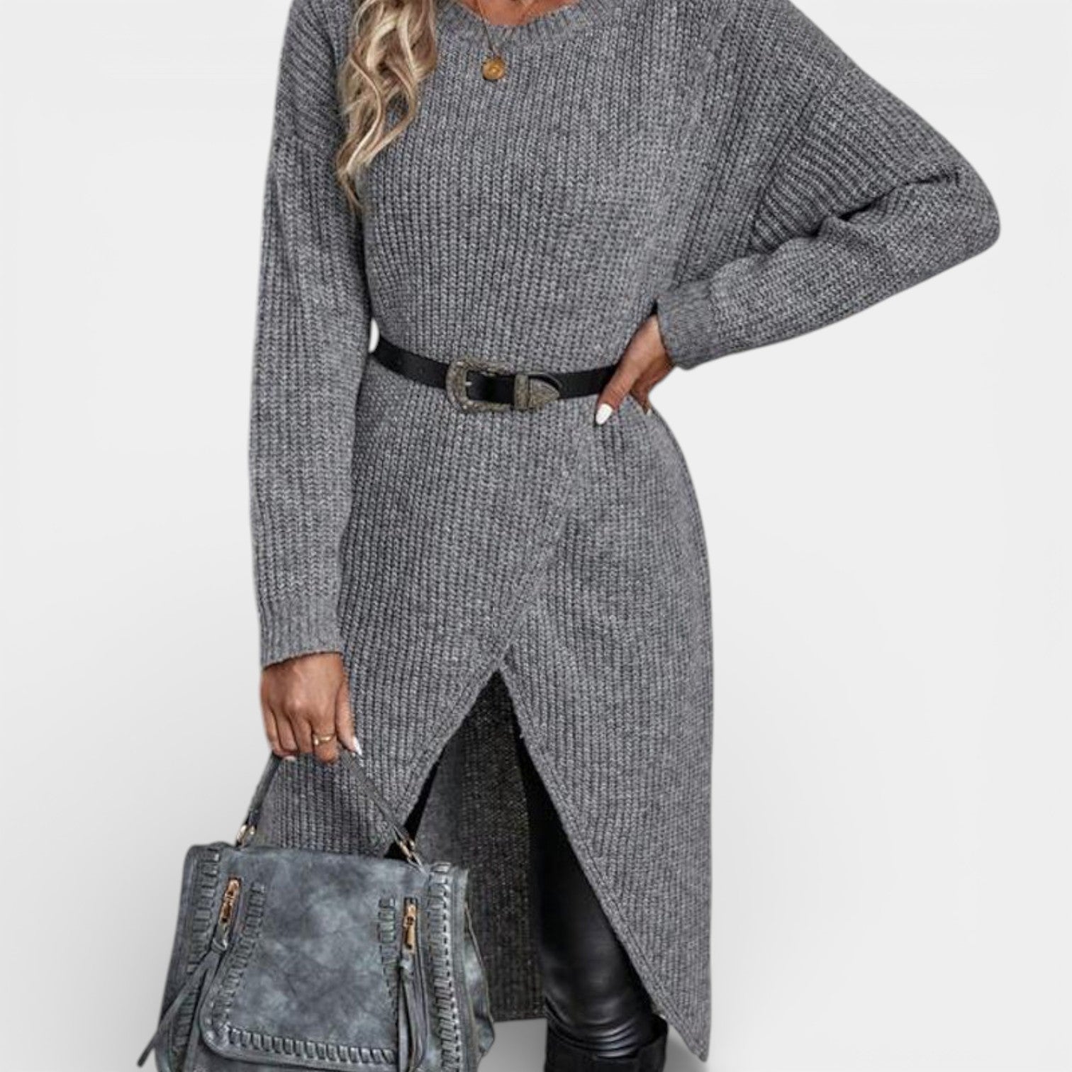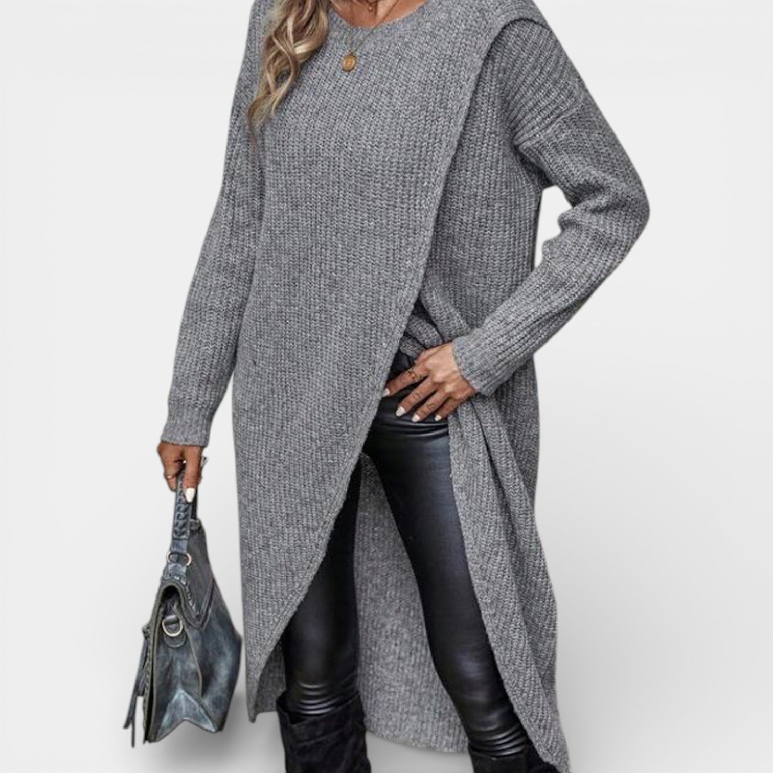 Tento dlouhý svetr redefinuje casual chic díky překrývajícímu se designu vpředu a příjemnému úpletu. Ideální pro kombinaci s legínami nebo džíny, nabízí moderní siluetu, která je jak stylová, tak univerzální. Měkký úplet zajišťuje komfort po celý den a volné rukávy umožňují svobodu pohybu, což činí Matyldu ideální volbou pro každodenní styling doma, v práci nebo během městských setkání.