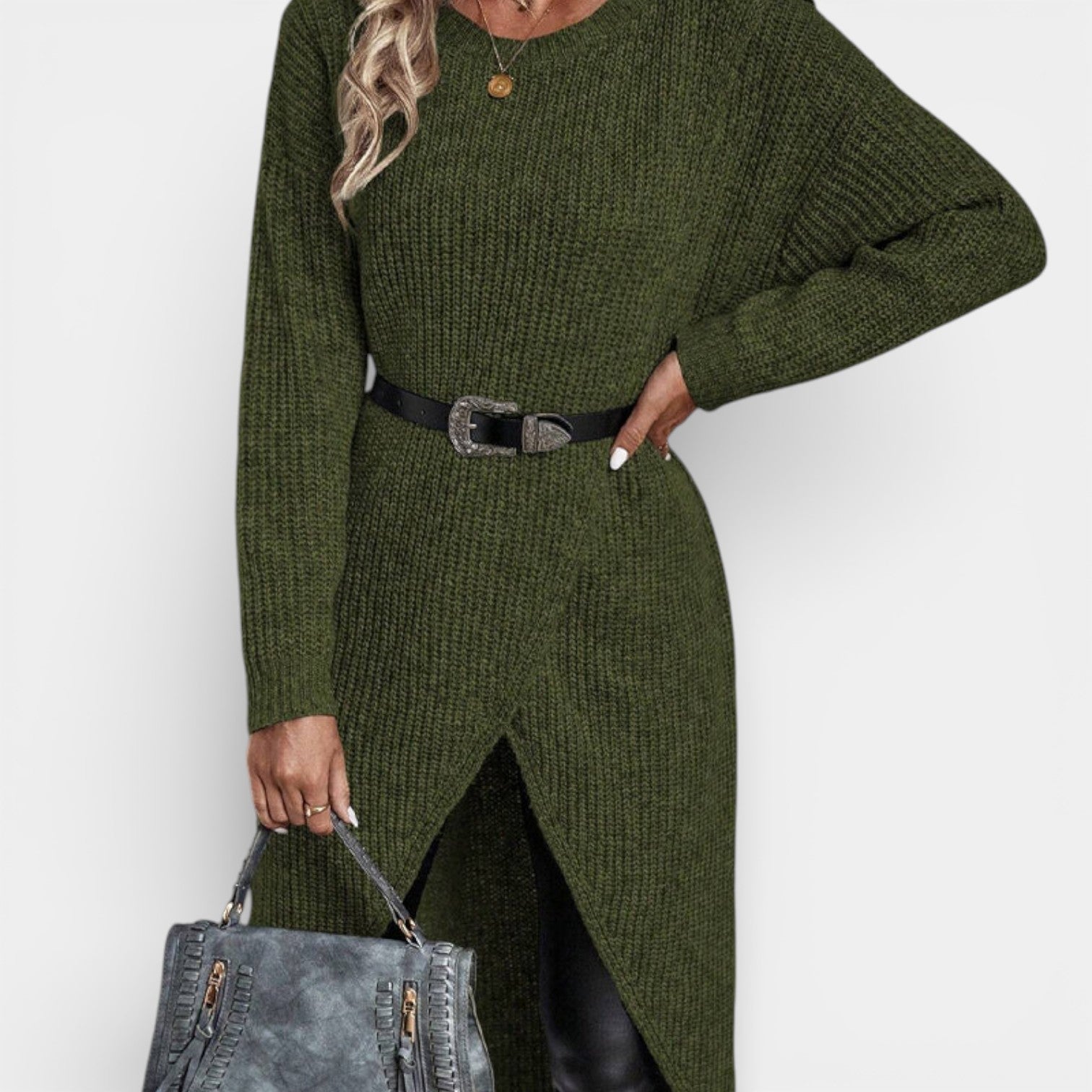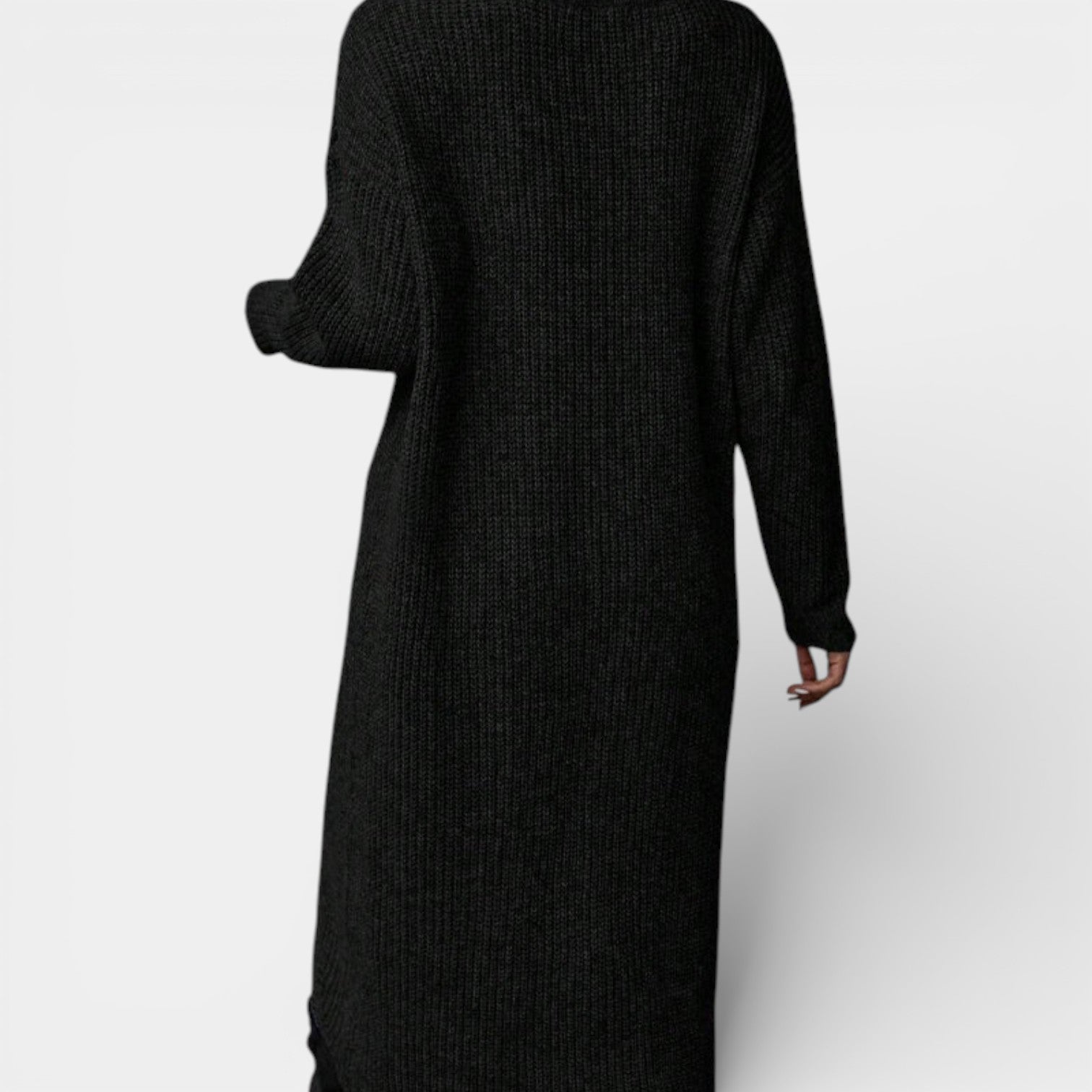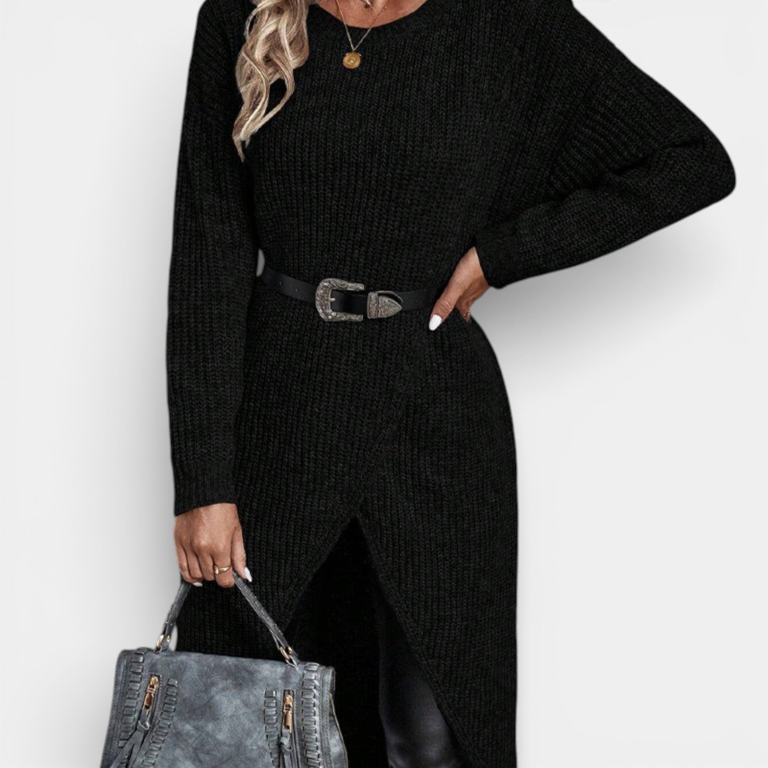 Tento dlouhý svetr redefinuje casual chic díky překrývajícímu se designu vpředu a příjemnému úpletu. Ideální pro kombinaci s legínami nebo džíny, nabízí moderní siluetu, která je jak stylová, tak univerzální. Měkký úplet zajišťuje komfort po celý den a volné rukávy umožňují svobodu pohybu, což činí Matyldu ideální volbou pro každodenní styling doma, v práci nebo během městských setkání.