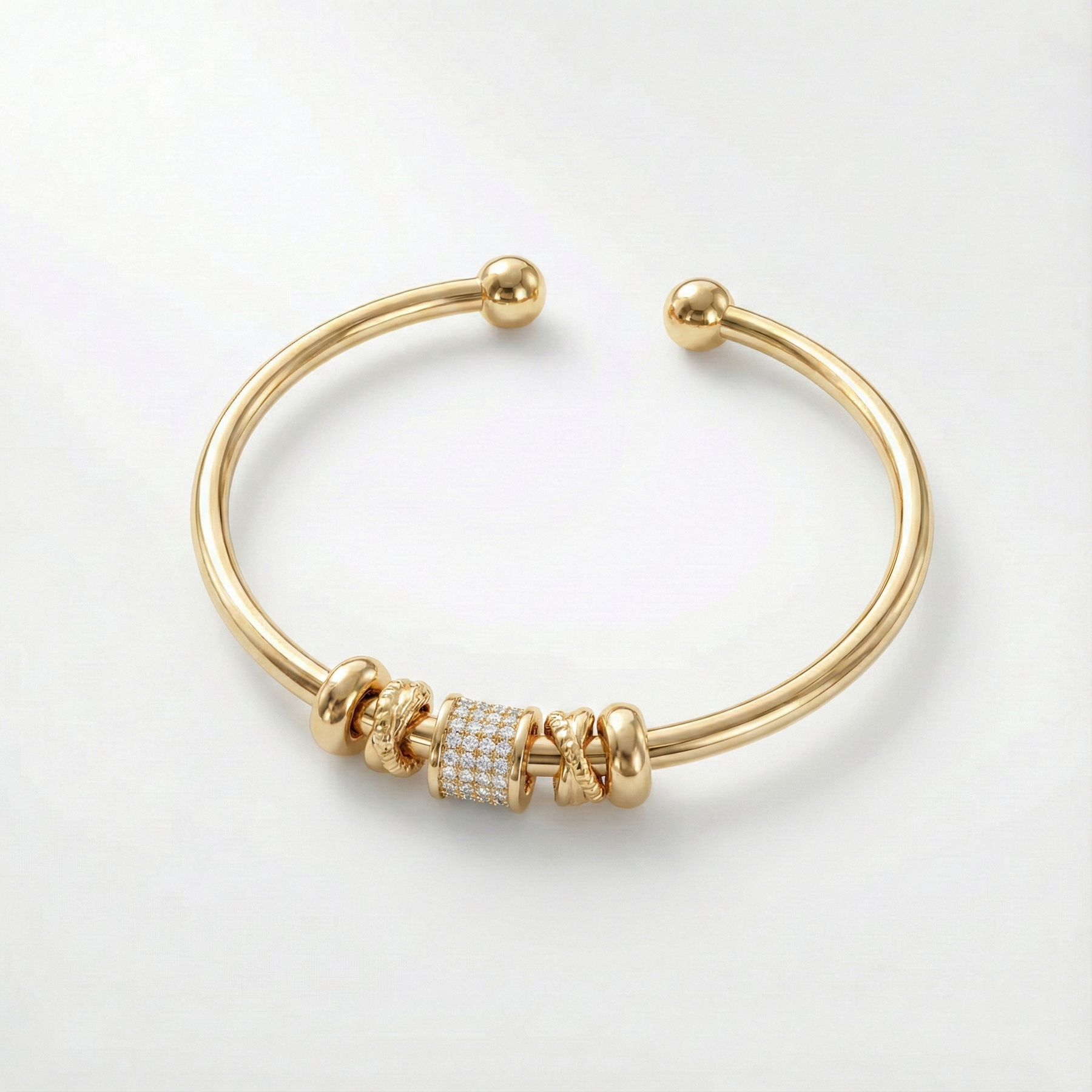 Nina spojuje moderní eleganci s nádechem hravé rafinovanosti. Otevřený, nastavitelný design se jemně přizpůsobí každému zápěstí, zatímco filigránské kouzla jemně září při každém pohybu. Minimalistický kousek pro prohlášení – vznešený, nadčasový a naprosto univerzální.